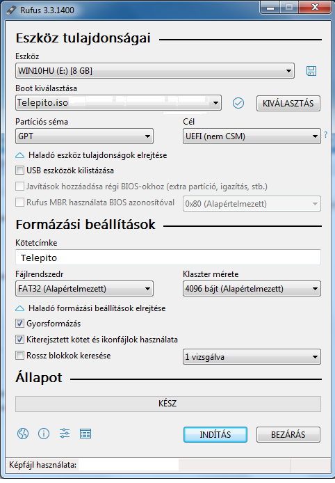 Fontos, hogy a pendrájv és az ISO fájl helyének kitallózása után a 'Particiós séma' GPT legyen.
